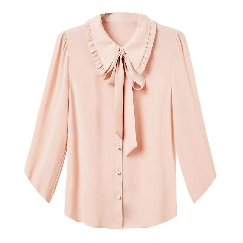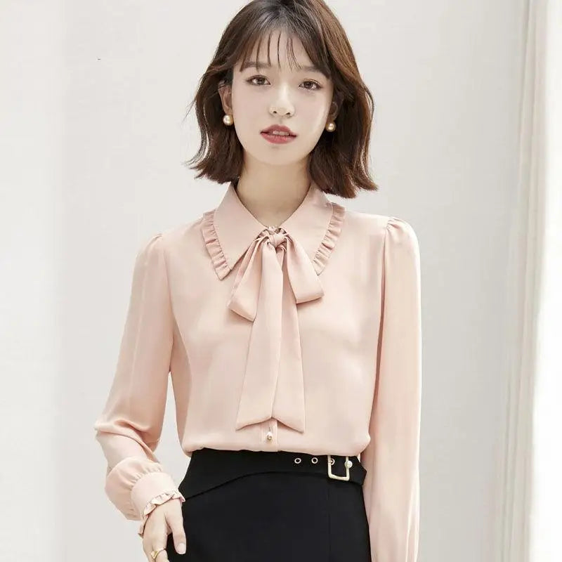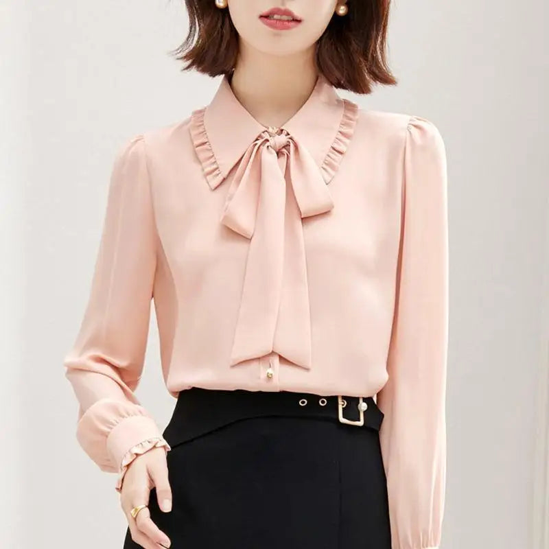 Blouses Female Elegant Fashion Office Lady Bow Solid Chiffon Shirts Women Clothing Spring Autumn Long Sleeve V-Neck Pullover Top