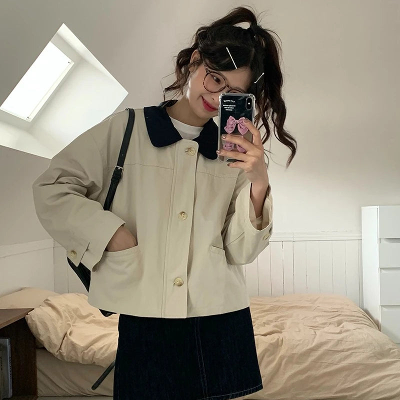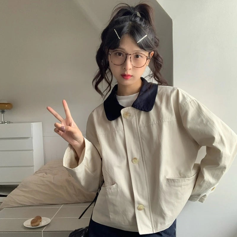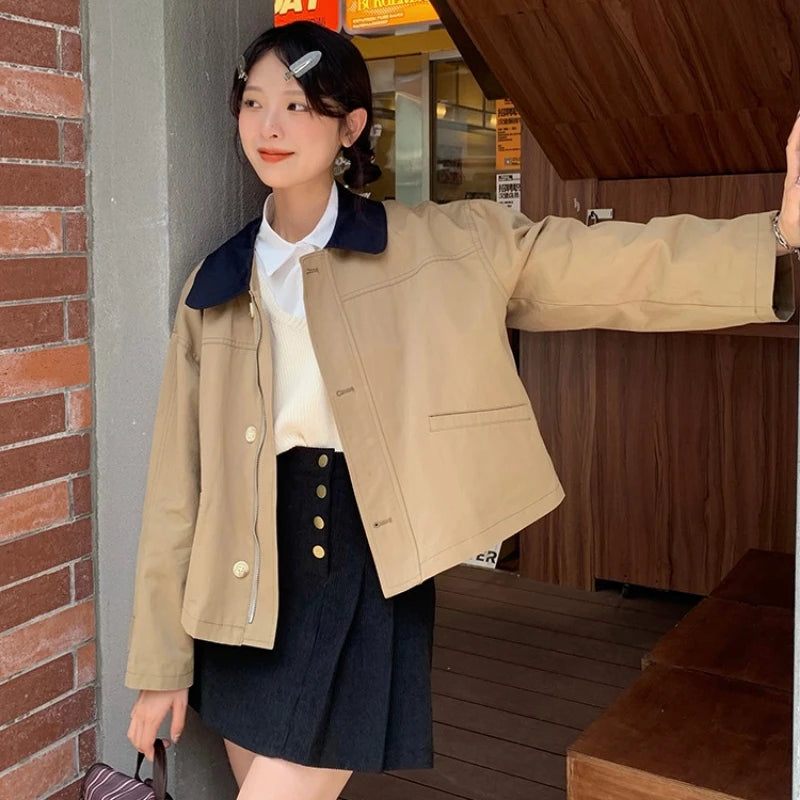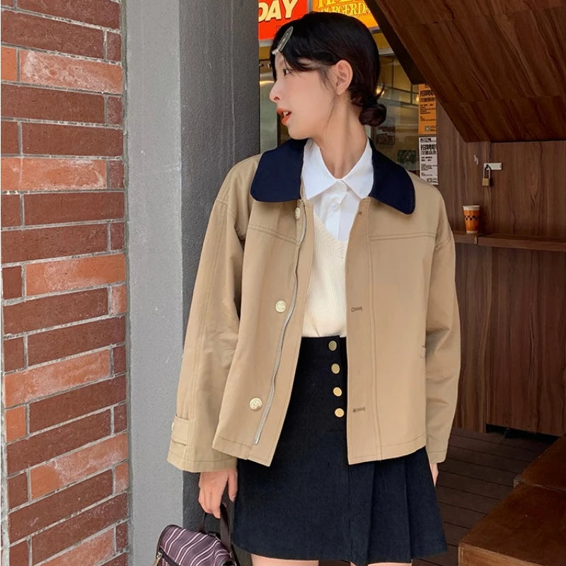 Color Collision Single-breasted Jackets Women Polo-neck Long Sleeve Zipper Solid Color Japan Style Versatile Short Coats Female