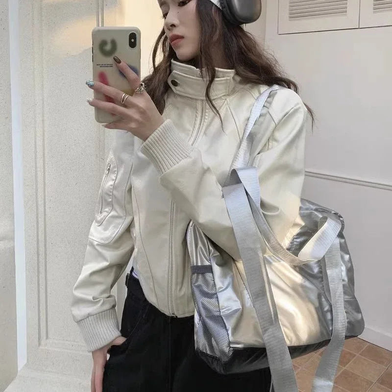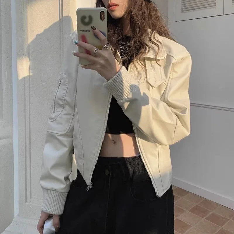 Gidyq Autumn Women Leather Jacket American Retro Streetwear Loose Motorcycle Coats Casual Female All Match Zipper Outerwear New