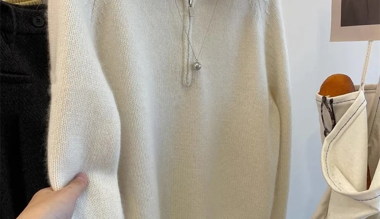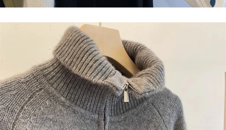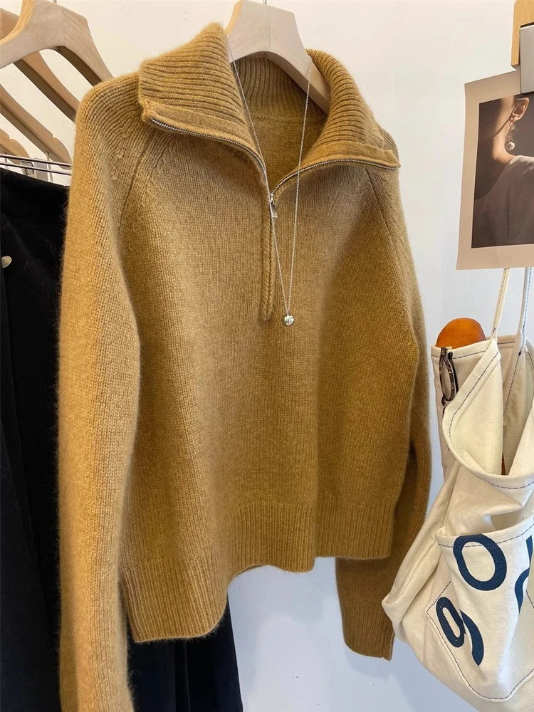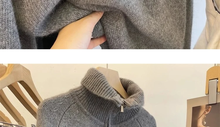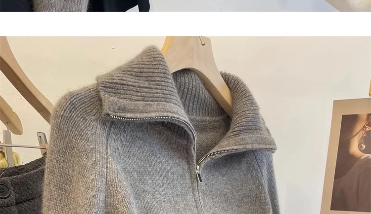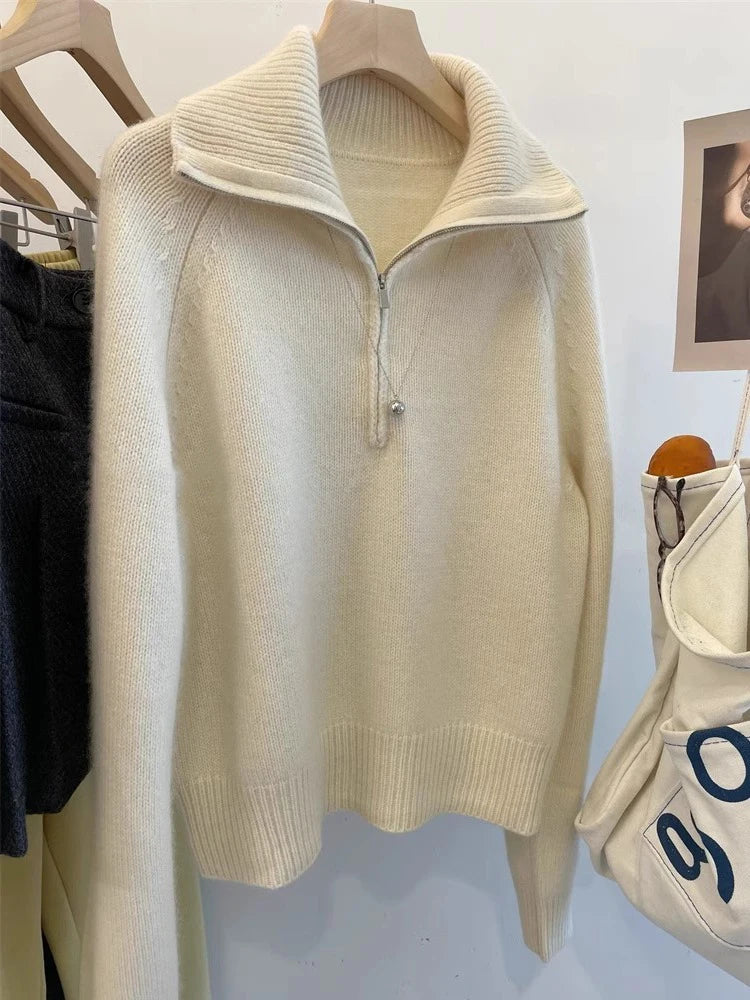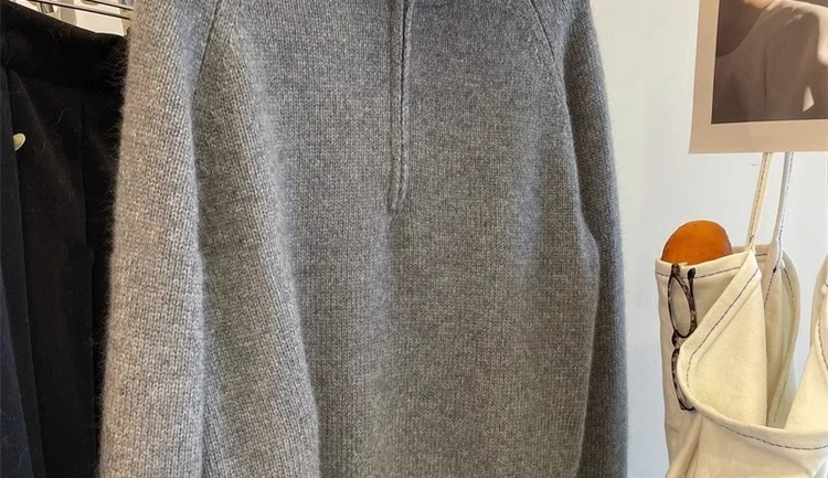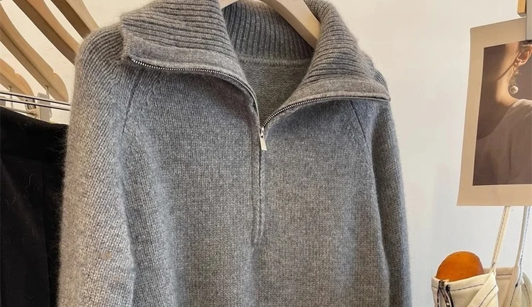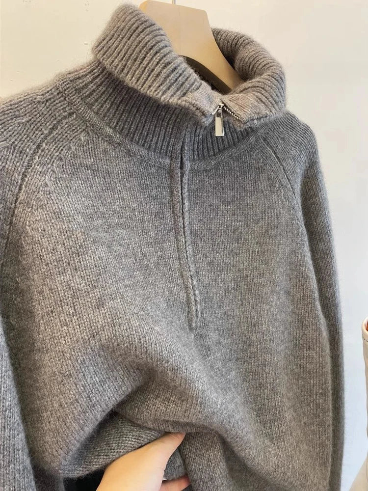 Grey Half Zipper Pullover Sweater for Women 2024 New Autumn Korean Style Long Sleeve Loose Casual Knitted Tops Female Clothing