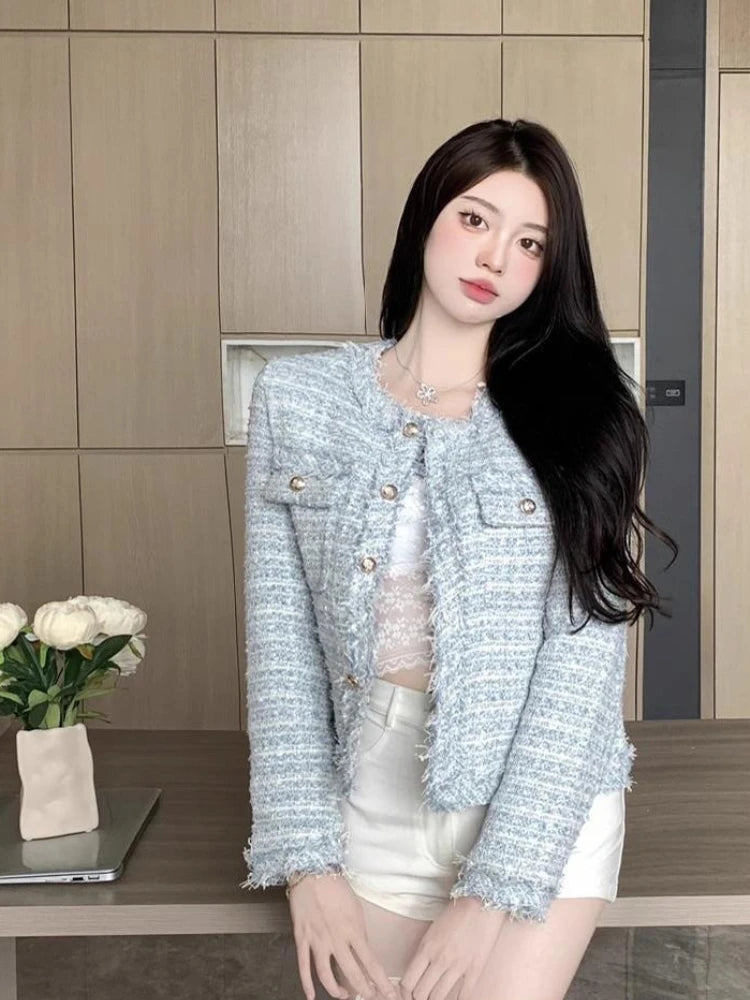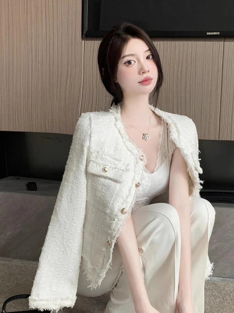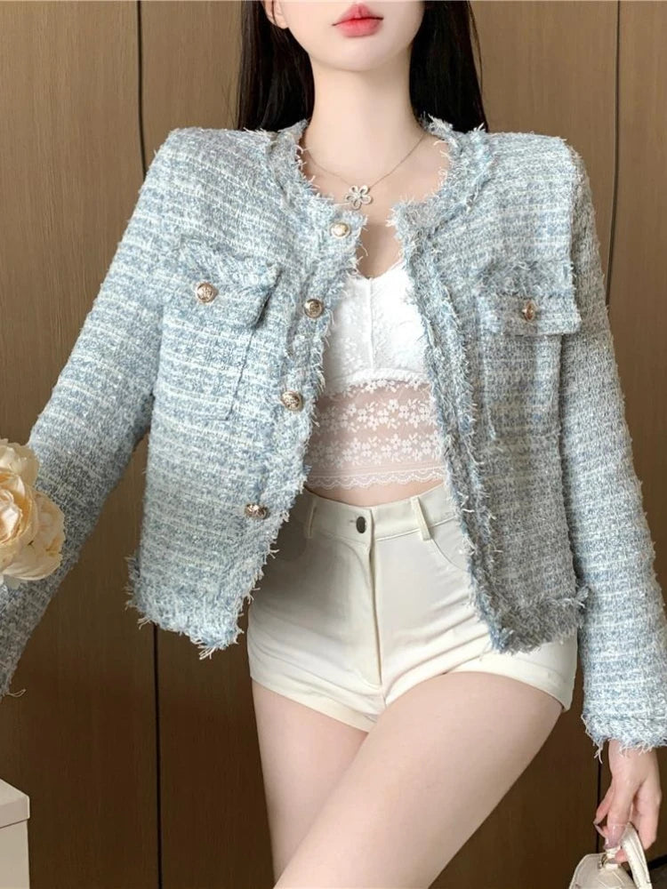Korean Fashion Vintage Tweed Woolen Jacket Coat Women Spring Autumn Single Breasted Plaid Tassel Office Lady Outwear Coat