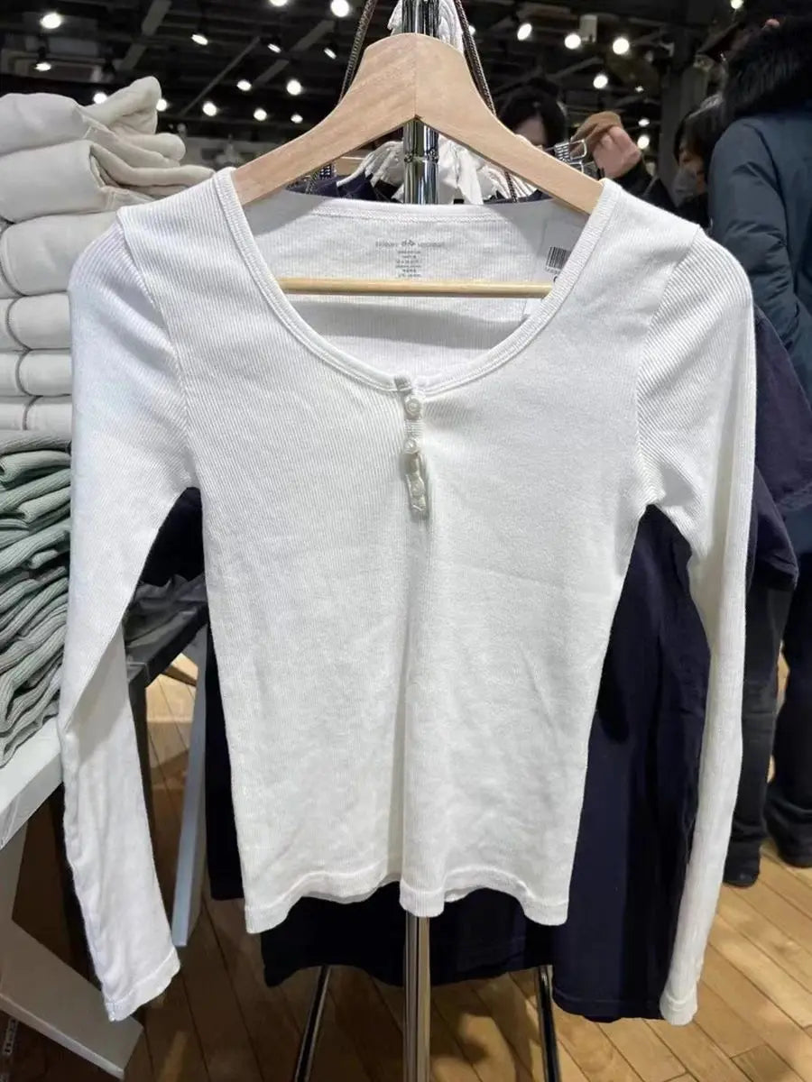 Three Buttons Ribbed Long Sleeve T-shirts Women Autumn Soft Cotton O-Neck Vintage Top Female Sweet Cute Pink Y2k Streetwear Tees