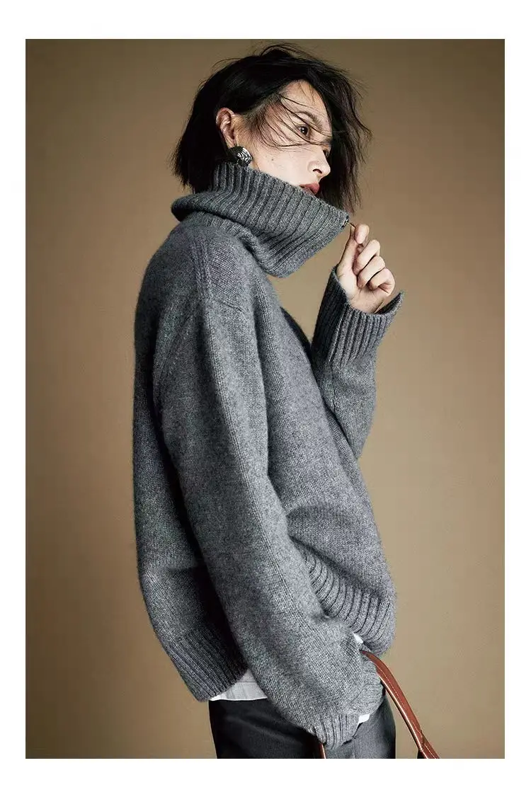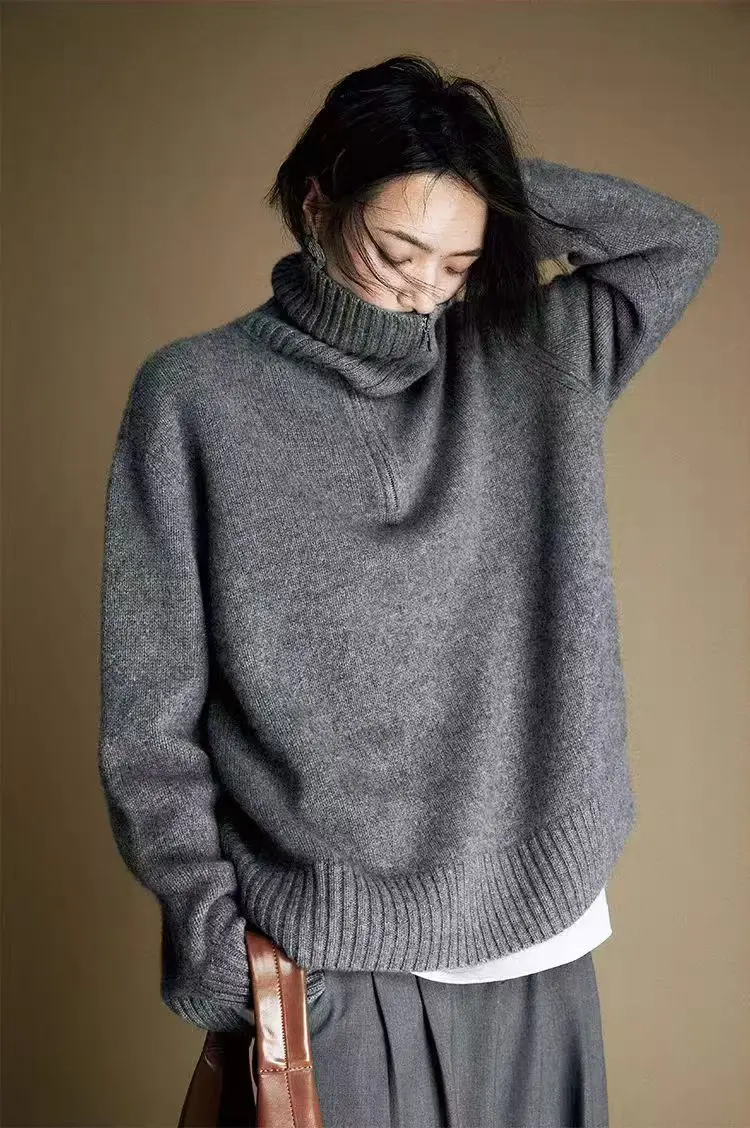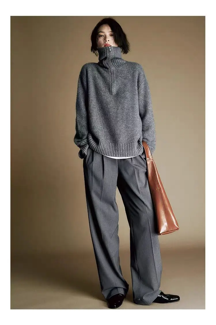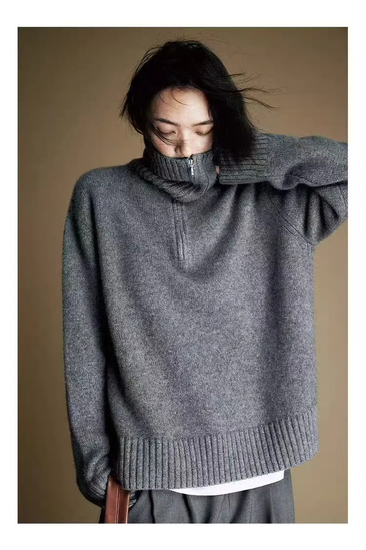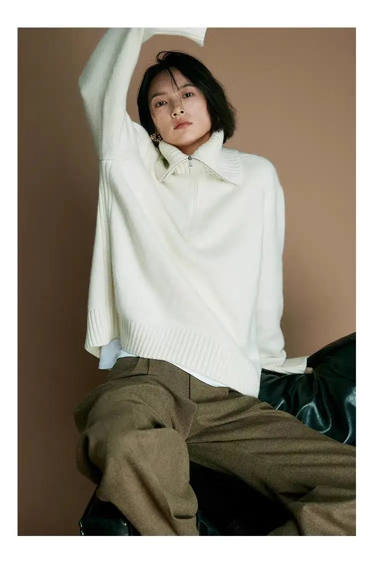 Women Merino Wool Sweater Half Zip Turtleneck Pullover Autumn Winter Casual Basic Knitwear Solid Color Regular Female Loose Tops