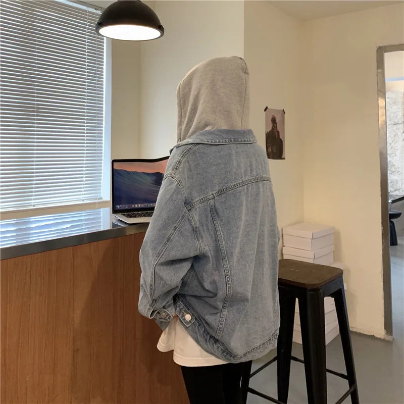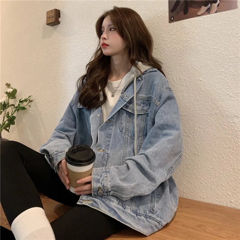 Women's Hooded Denim Jacket 2024 Spring Fall Collection Light Wash Korean-Inspired Oversized Casual Coat Trendy Streetwear Top