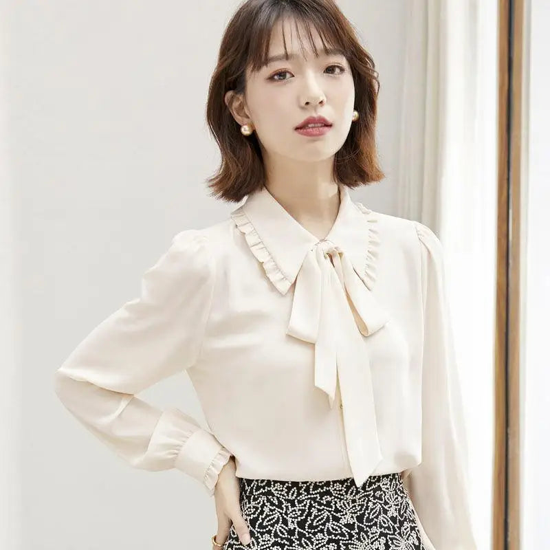 Blouses Female Elegant Fashion Office Lady Bow Solid Chiffon Shirts Women Clothing Spring Autumn Long Sleeve V-Neck Pullover Top
