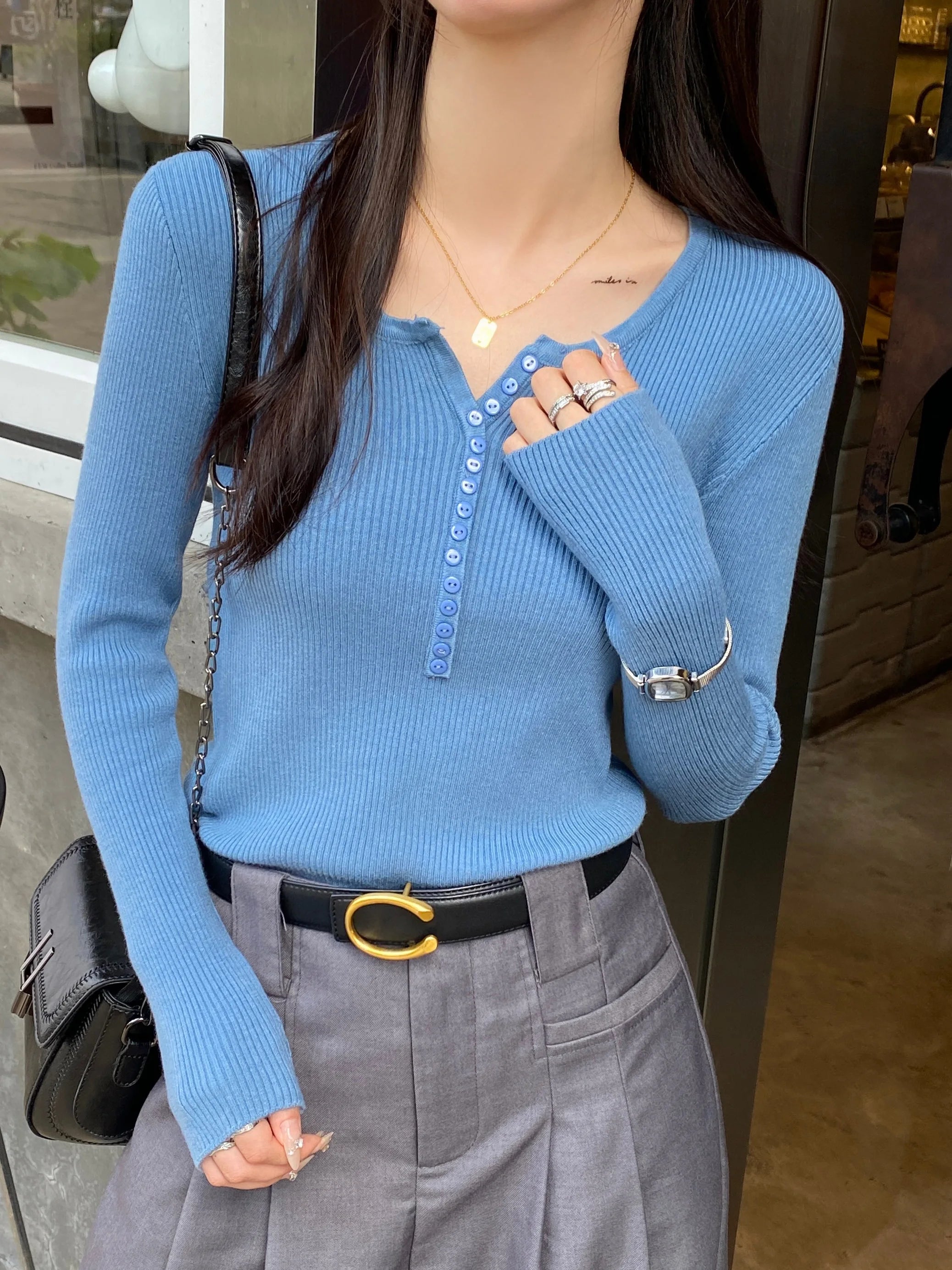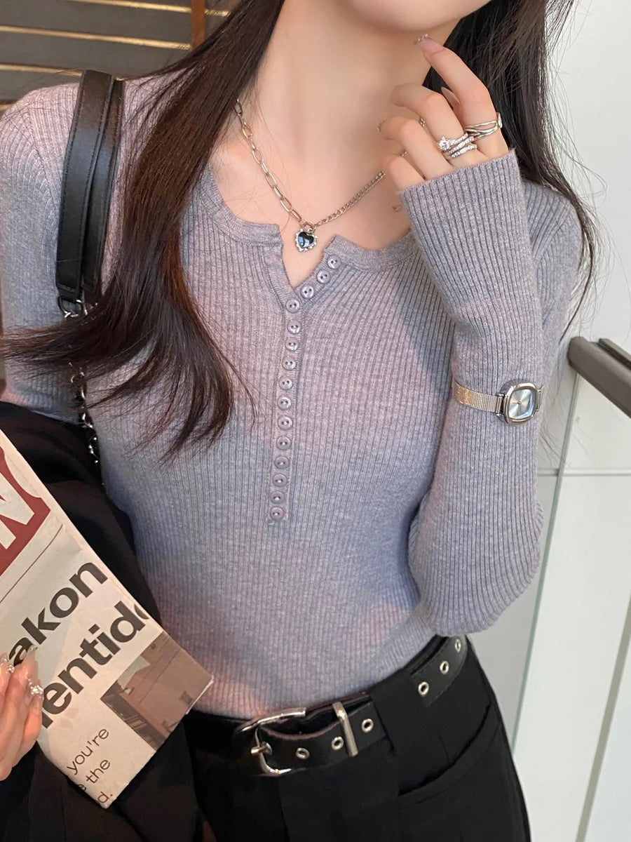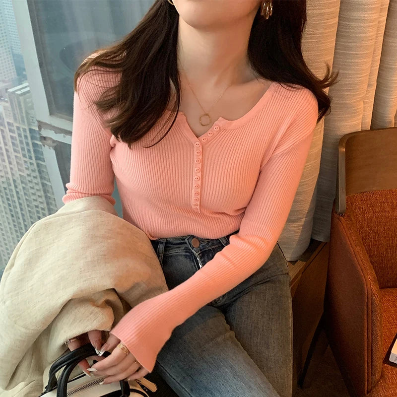 Button Long Sleeve Knitted Slim Fit Pullovers 2025 Autumn Winter V-Neck Women Sweater Korean Style Simple Base Layer Sweaters