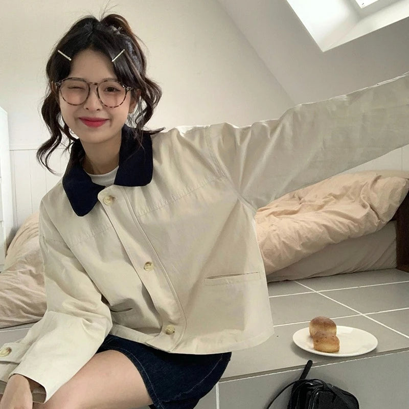 Color Collision Single-breasted Jackets Women Polo-neck Long Sleeve Zipper Solid Color Japan Style Versatile Short Coats Female