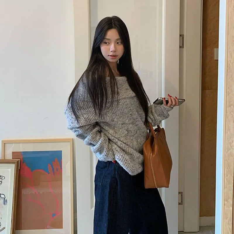 Elegant Off Shoulder Slash Neck Sweaters Women Korean Fashion Streetwear Thicken Knitted Jumpers Casual Loose Slimming Pullovers