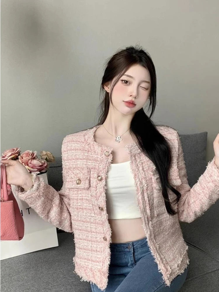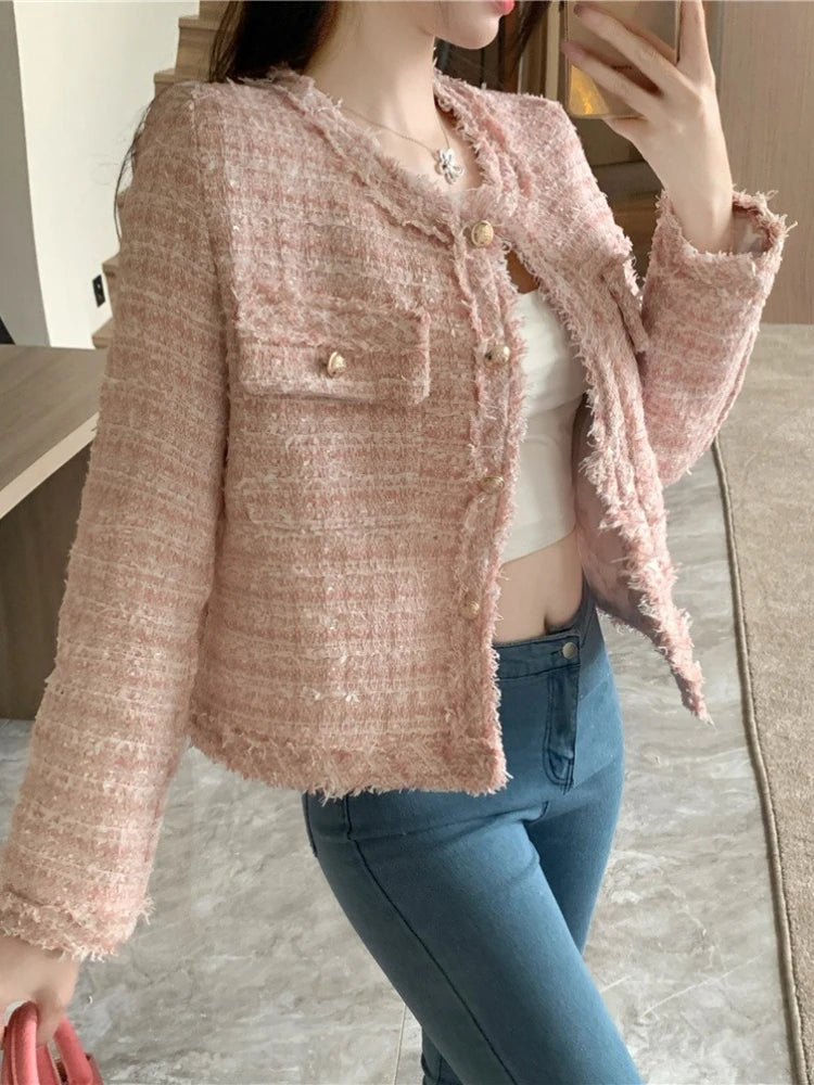 Korean Fashion Vintage Tweed Woolen Jacket Coat Women Spring Autumn Single Breasted Plaid Tassel Office Lady Outwear Coat