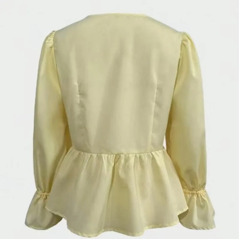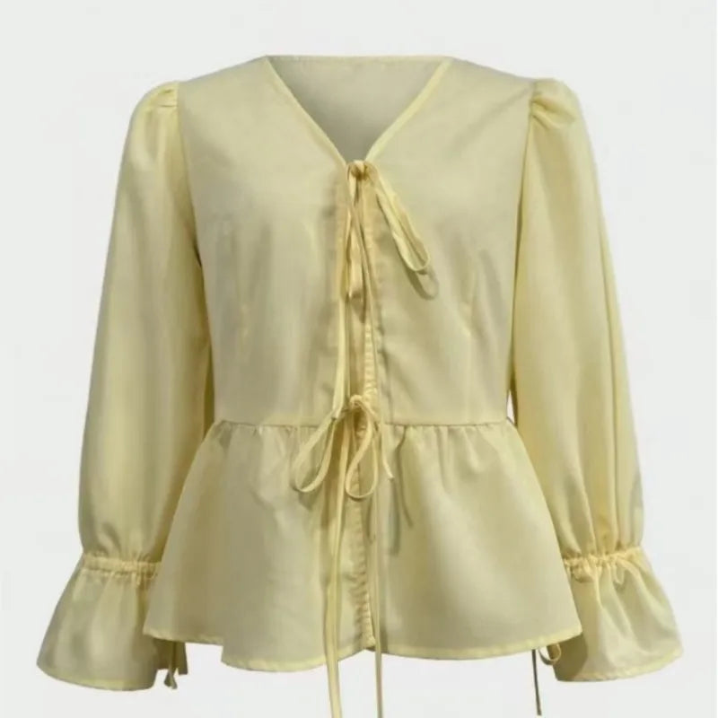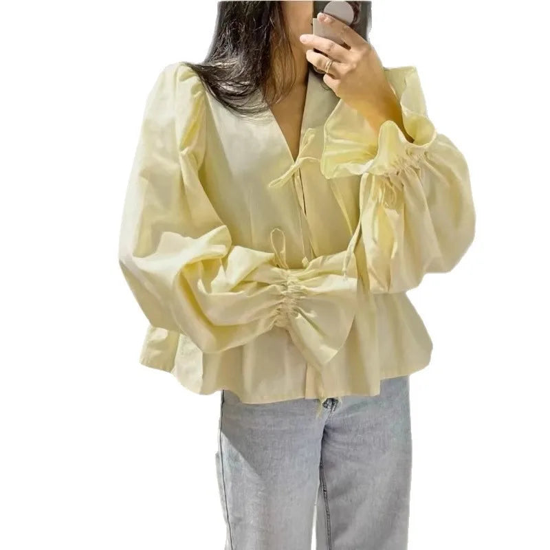 Women Loose Casual Yellow Shirt 2025 Autumn V-neck Pleated Lace-up Puff Sleeve Shirts & Blouses Sprint Streetwear Tops