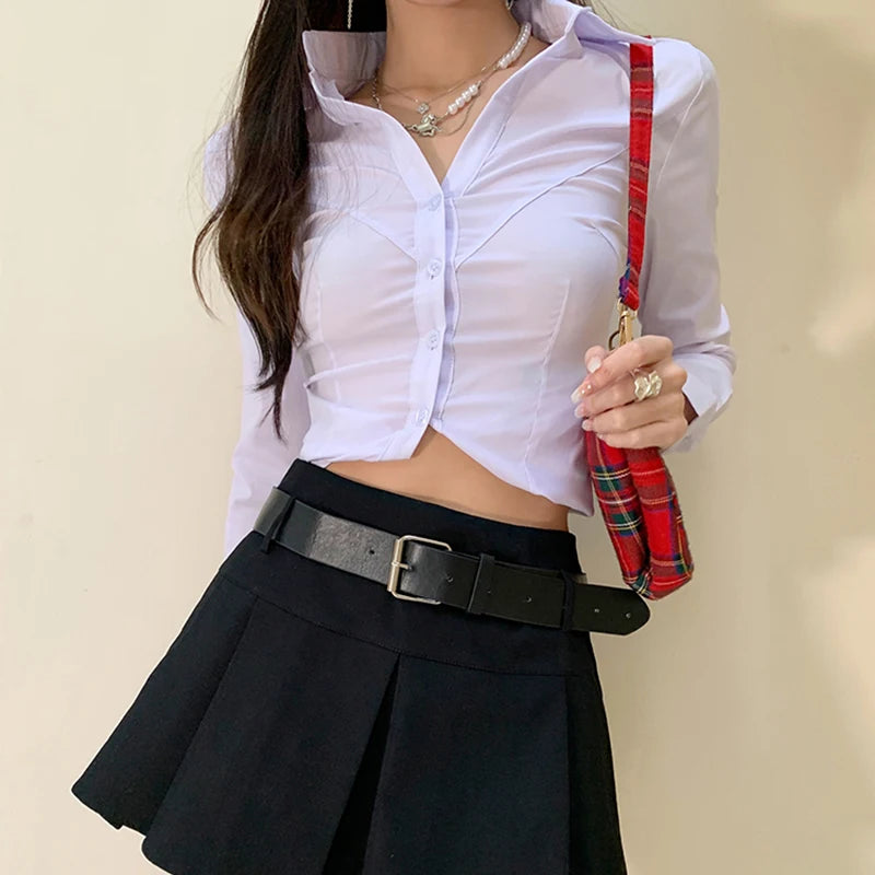 Y2k White Women Crop Shirts Korean Sexy Slim Long Sleeve Female Casual Blouse Autumn New Office All Match Button Ladies Tops